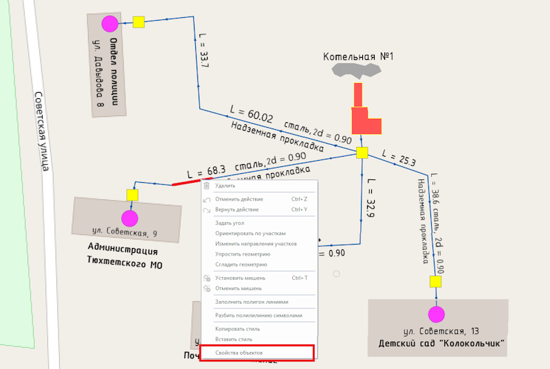 Рассмотрим на примере участка тепловой сети в с. Тюхтет от котельной № 1 подключено 4 объекта. Администрация Тюхтетского муниципального округа с. Тюхтет ул. Советская 9, Отдел полиции с. Тюхтет ул. Давыдова 8, Почтовое отделение с. Тюхтет ул. Советская 11, детский садик «Колокольчик» с. Тюхтет ул. Советская 13